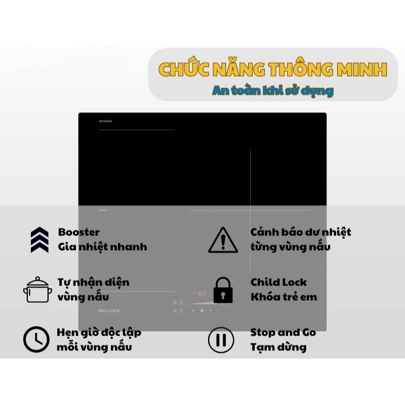 Bếp từ âm 3 vùng nấu Malloca MI593FZ là lựa chọn lý tưởng cho những không gian bếp hiện đại cần sự gọn gàng nhưng vẫn đảm bảo hiệu năng nấu nướng mạnh mẽ. Với thiết kế vuông độc đáo, mặt kính EuroKera cao cấp cùng ba vùng nấu linh hoạt, sản phẩm mang đến trải nghiệm nấu ăn nhanh chóng, an toàn và tiện nghi, đồng thời tạo điểm nhấn sang trọng cho khu vực bếp.