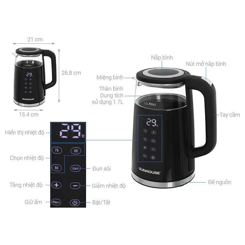 - Tính năng an toàn tự động: Ngắt điện khi nước sôi, khi cạn nước hoặc quá nhiệt.